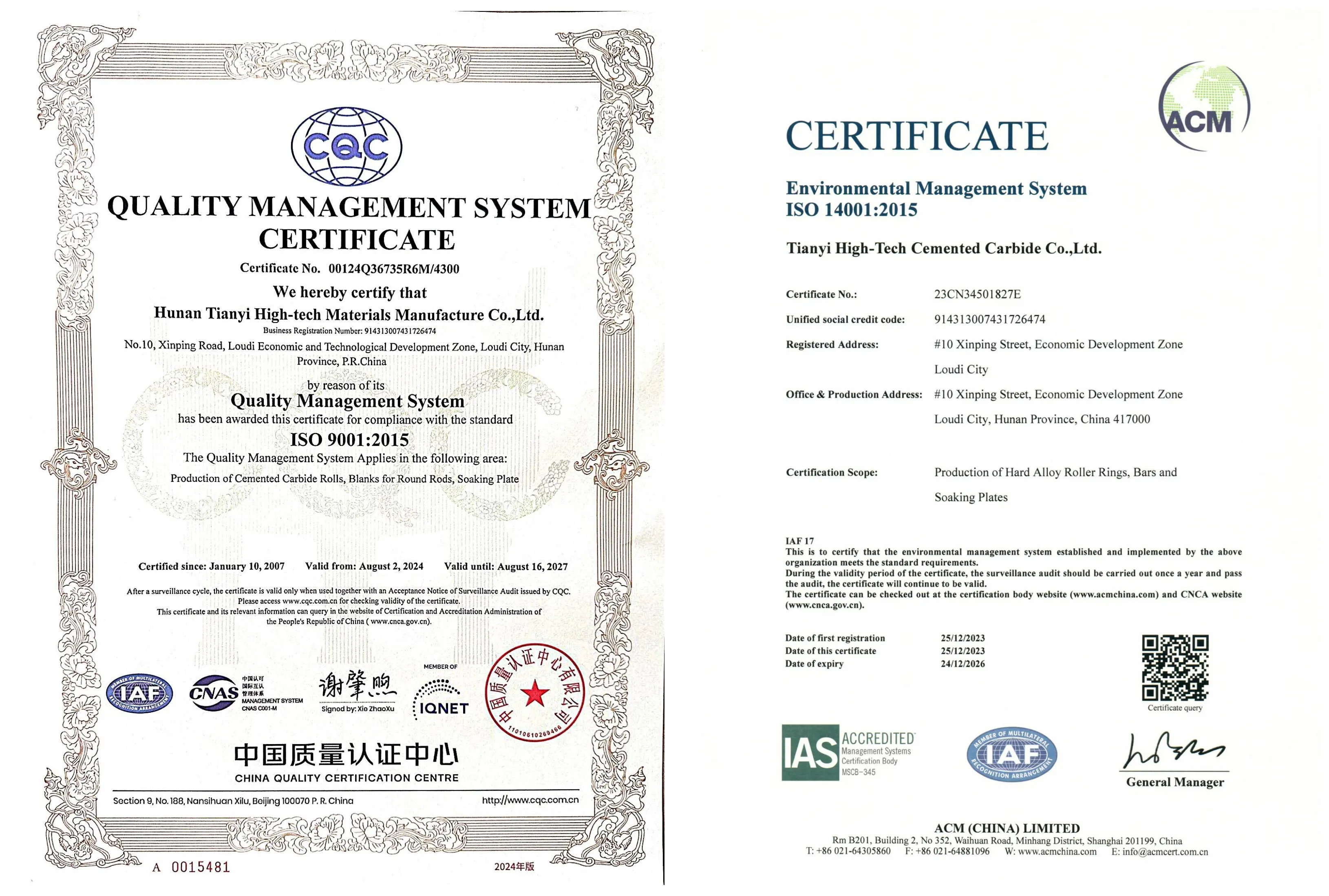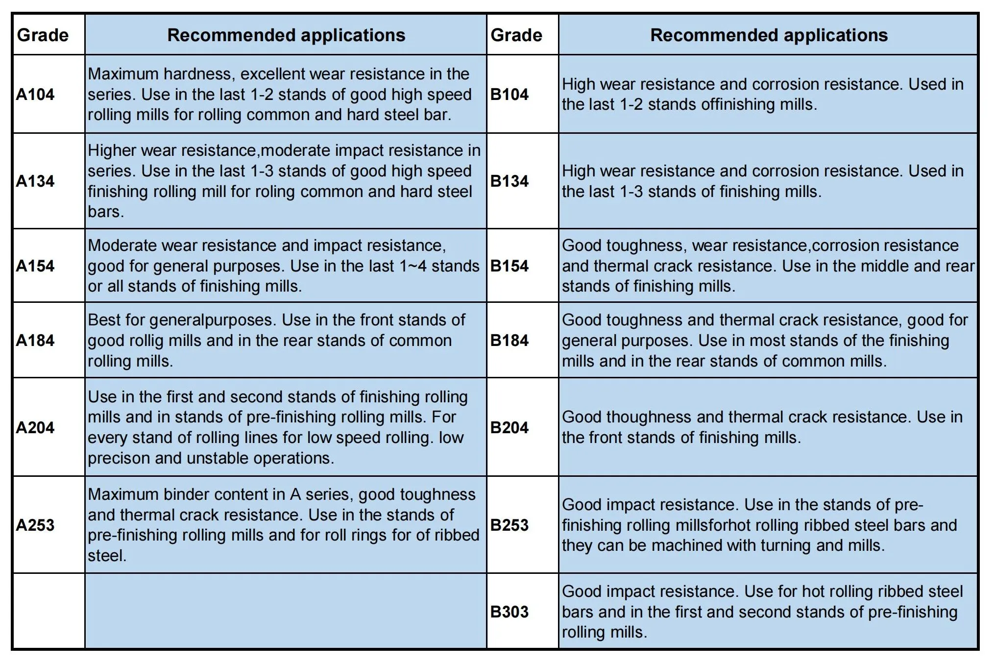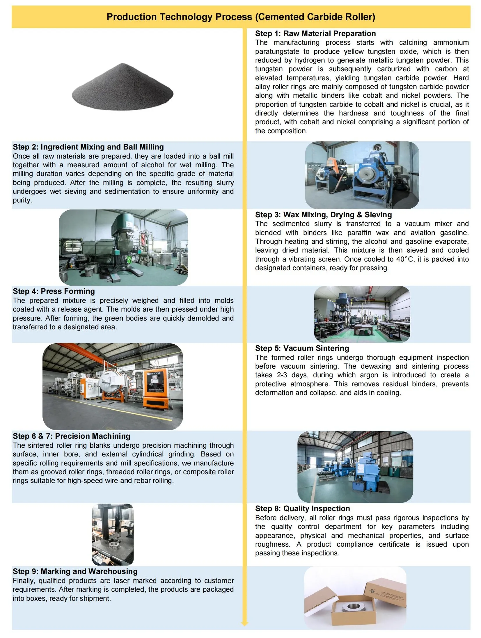 Les anneaux de rouleau en carbure cémenté (également connus sous le nom d'anneaux de rouleau en carbure de tungstène) offrent une excellente conductivité thermique et surpassent les rouleaux en fonte et en acier rapide de première génération en termes de résistance à la chaleur, de résistance à l'usure et de résistance, avec une réduction minimale de la dureté à haute température. Développés parallèlement aux laminoirs à fil machine à grande vitesse, ils sont désormais largement utilisés dans les stands de finition pour la fabrication de fils à grande vitesse, de barres d'armature et de barres d'acier déformées.